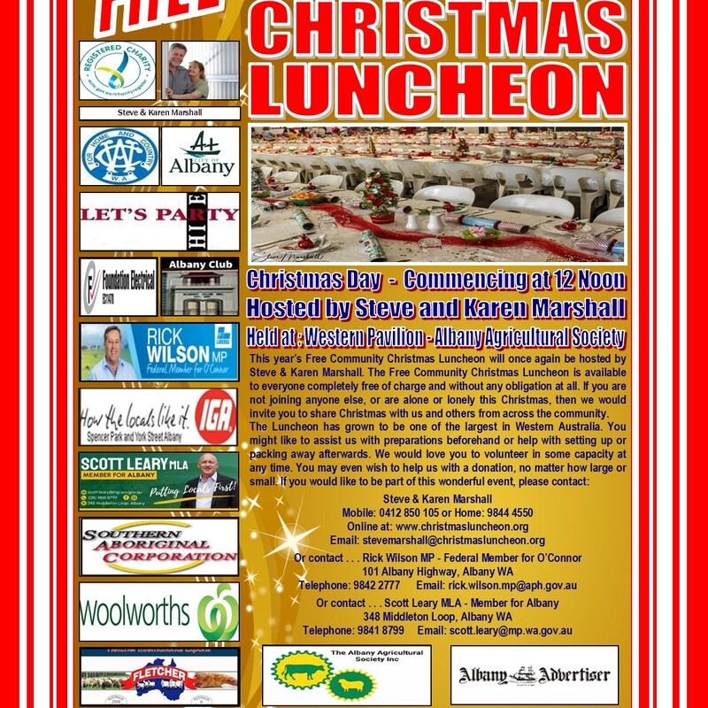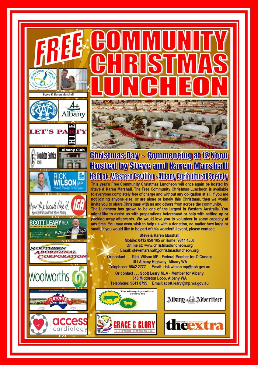 The Free Community Christmas Luncheon will once again be hosted by Steve & Karen Marshall from Grace & Glory Ministries International.